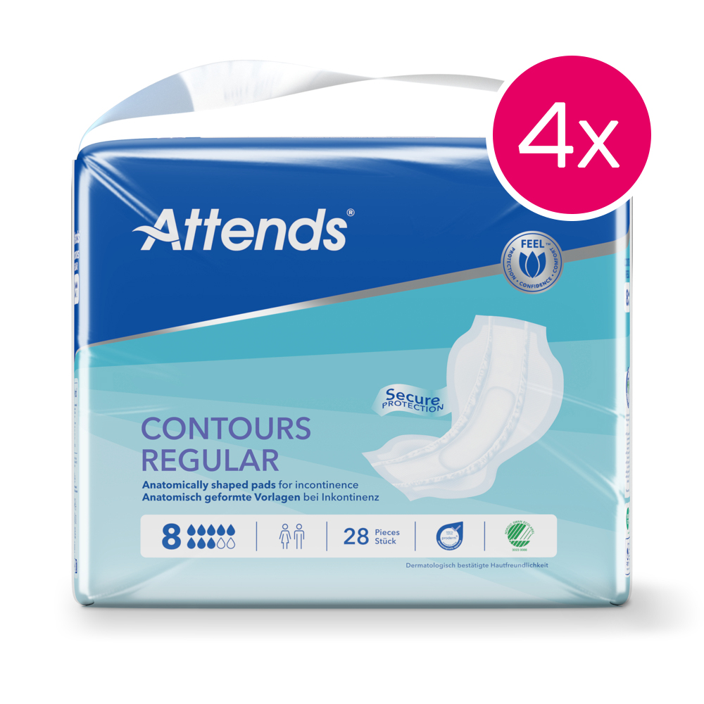 Die ATTENDS Contours Regular 8 sind anatomisch geformte Vorlagen bei starker Harn- und Stuhlinkontinenz. Das Design der Einlagen lassen sie eng am Körper anliegen und bieten zusätzlichen Komfort und Auslaufschutz. Der leistungsstarke Saugkern schließt auch große Flüssigkeitsmengen sicher im Innern der Vorlagen ein. Die Seitenbündchen garantieren zusätzliche Sicherheit. Die speziell entwickelte Odour Protection verhindert unangenehme Gerüche. Der Nässeindikator auf der Rückseite zeigt durch Verschwimmen an, wann das Produkt gewechselt werden muss.