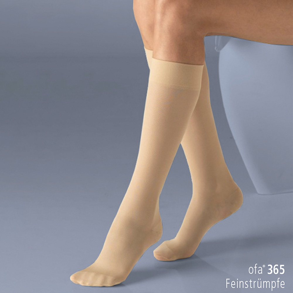 Vitale und schöne Beine mit den Kniestrümpfen (AD) von OFA® 365 in 70 den. Diese sehen nicht nur sehr elegant aus sondern besitzen auch eine angenehme Stützkraft, welche dazu beitragen kann, die Beine zu entlasten und Ermüdung und Anschwellung durch zu langes Stehen oder Sitzen vorzubeugen.
