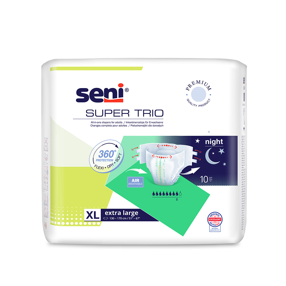 Die atmungsaktiven Seni Super Trio Inkontinenzhosen bieten zuverlässigen Schutz bei schwerer bis sehr schwerer Urin- und Stuhlinkontinenz. Dank des elastischen Bunds vorne und hinten sowie vier elastischen Klebeklettverschlüssen passen sie sich optimal an den Körper an.